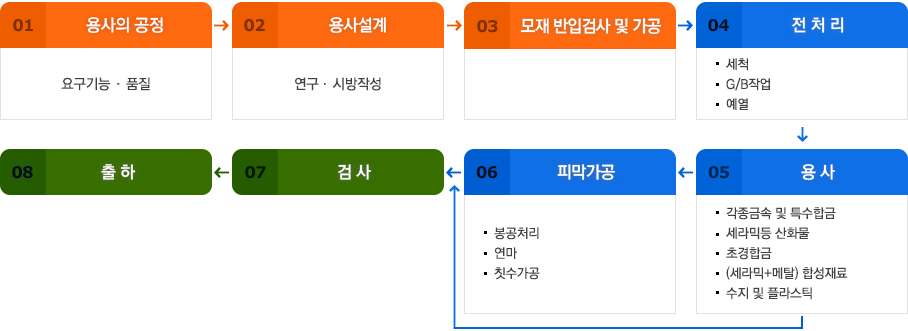 플라즈마용사 진공플라즈마 용사 고속용사 Nano Powder 고속용사 Gas Flame 용사 아크 용사 자용성합금용사 특화용사기술